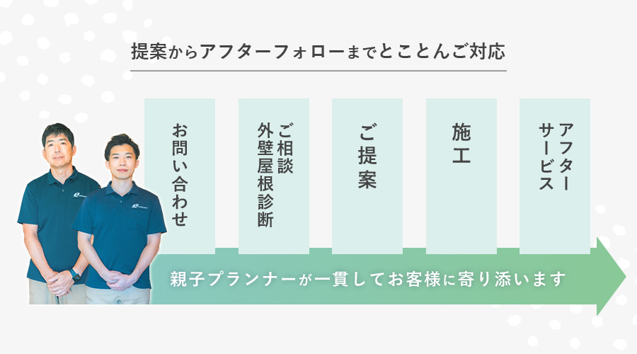 現地調査からご提案、施工管理、その後のアフターフォローまで1人の担当者が一貫して対応。最初から最後までとことん親身に対応をさせていただきます。
