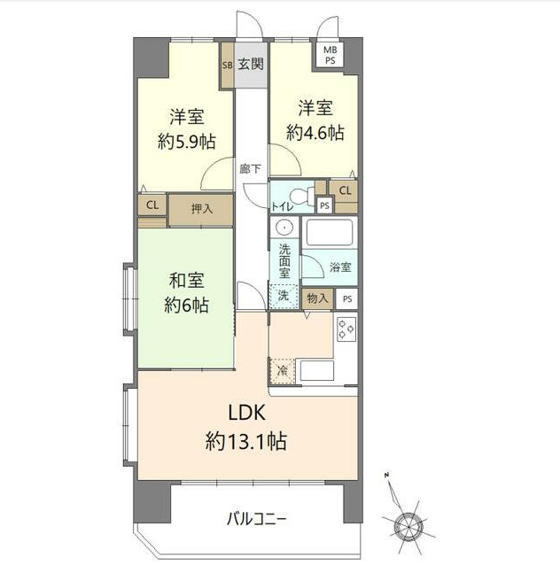 | 間取り | 3LDK (間取り内訳:和 6 洋 5.9・4.6 LDK 13.1 ) |