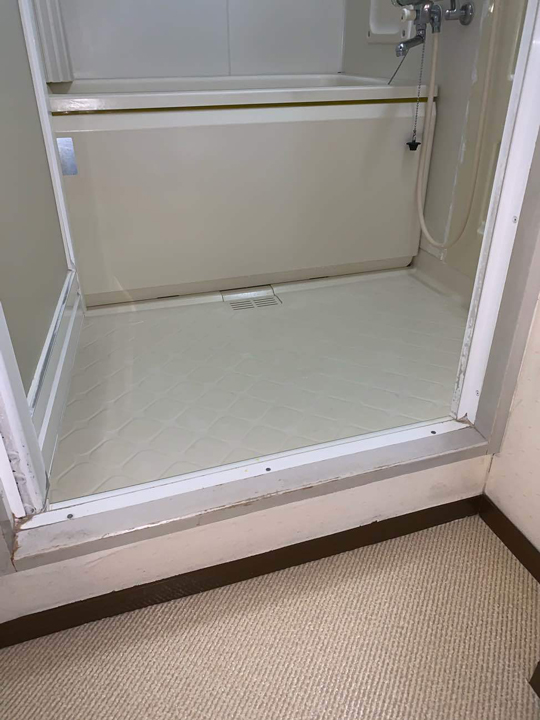 施工前の水まわりのお写真です。洗い場への段差や、汚れが目立っていた洗面所のフロア・低い吊り戸棚など使い勝手の悪い水まわりをリフォームしていきます。
