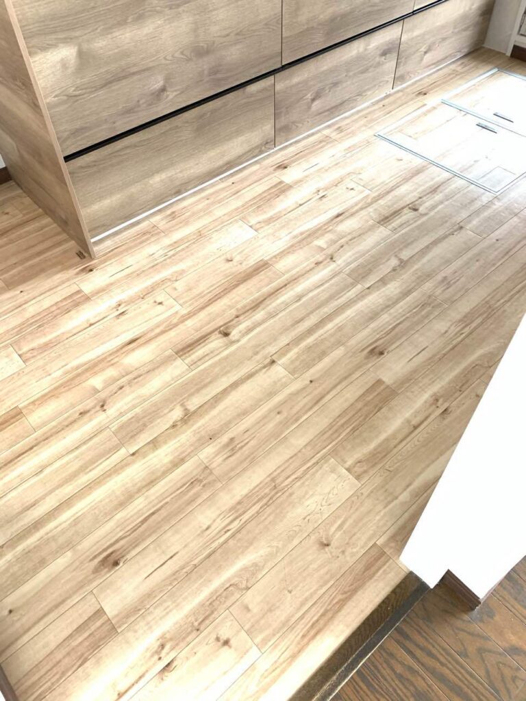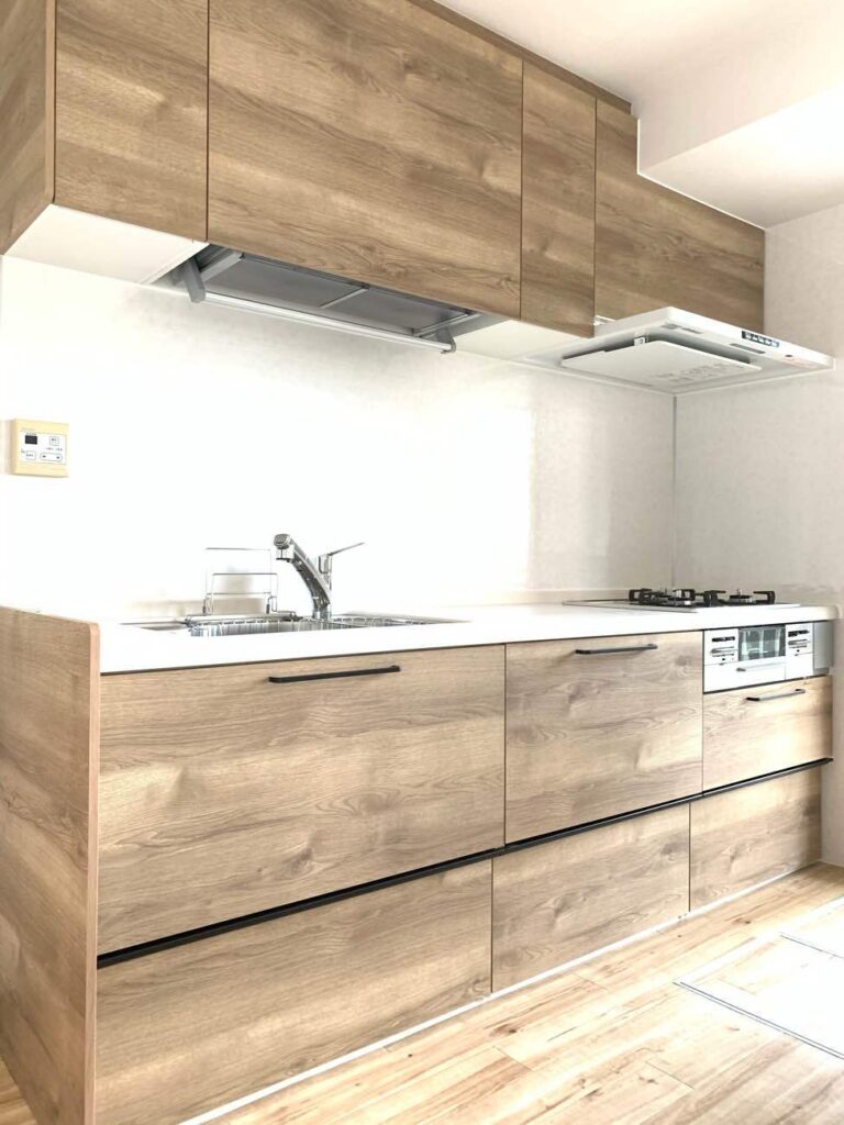 キッチンには、クリナップ ラクエラI型をご提案。また、フロアもウッド系のクッションフロアに貼り替えることでビンテージ感のあるキッチン扉にぴったりなおしゃれなキッチンになりました。