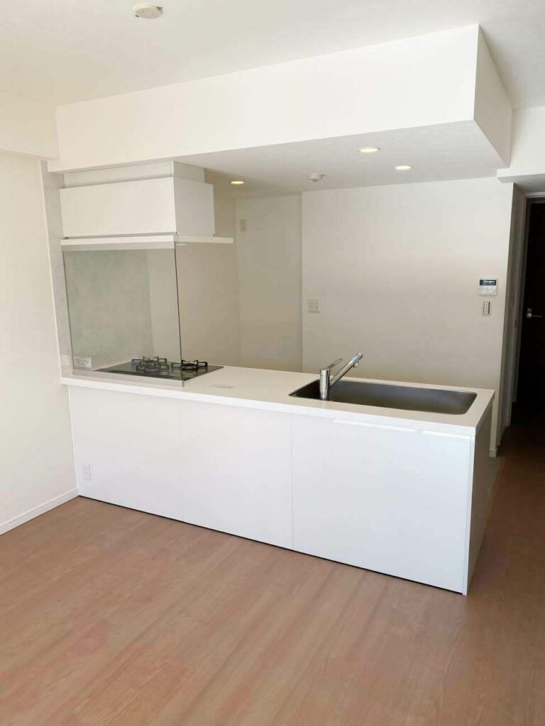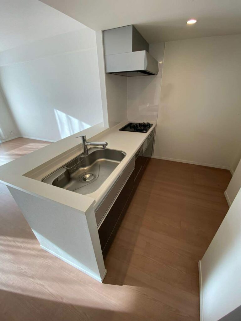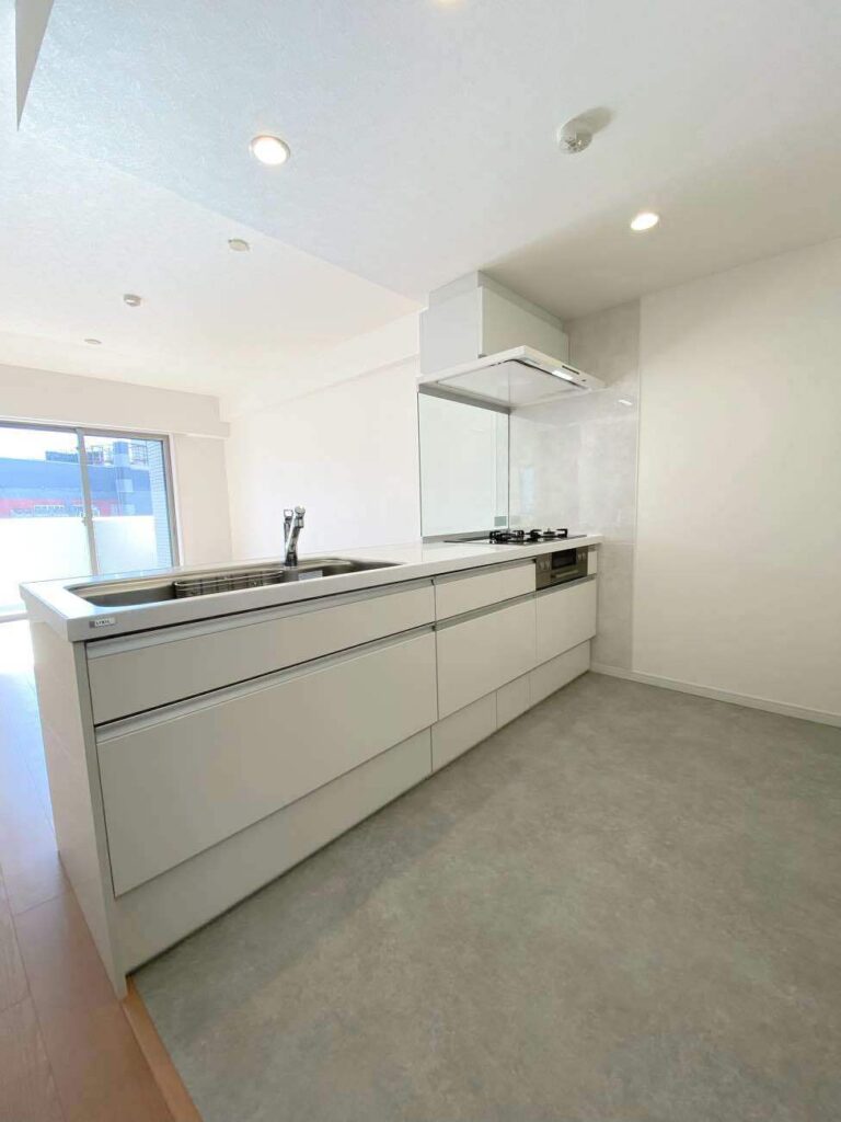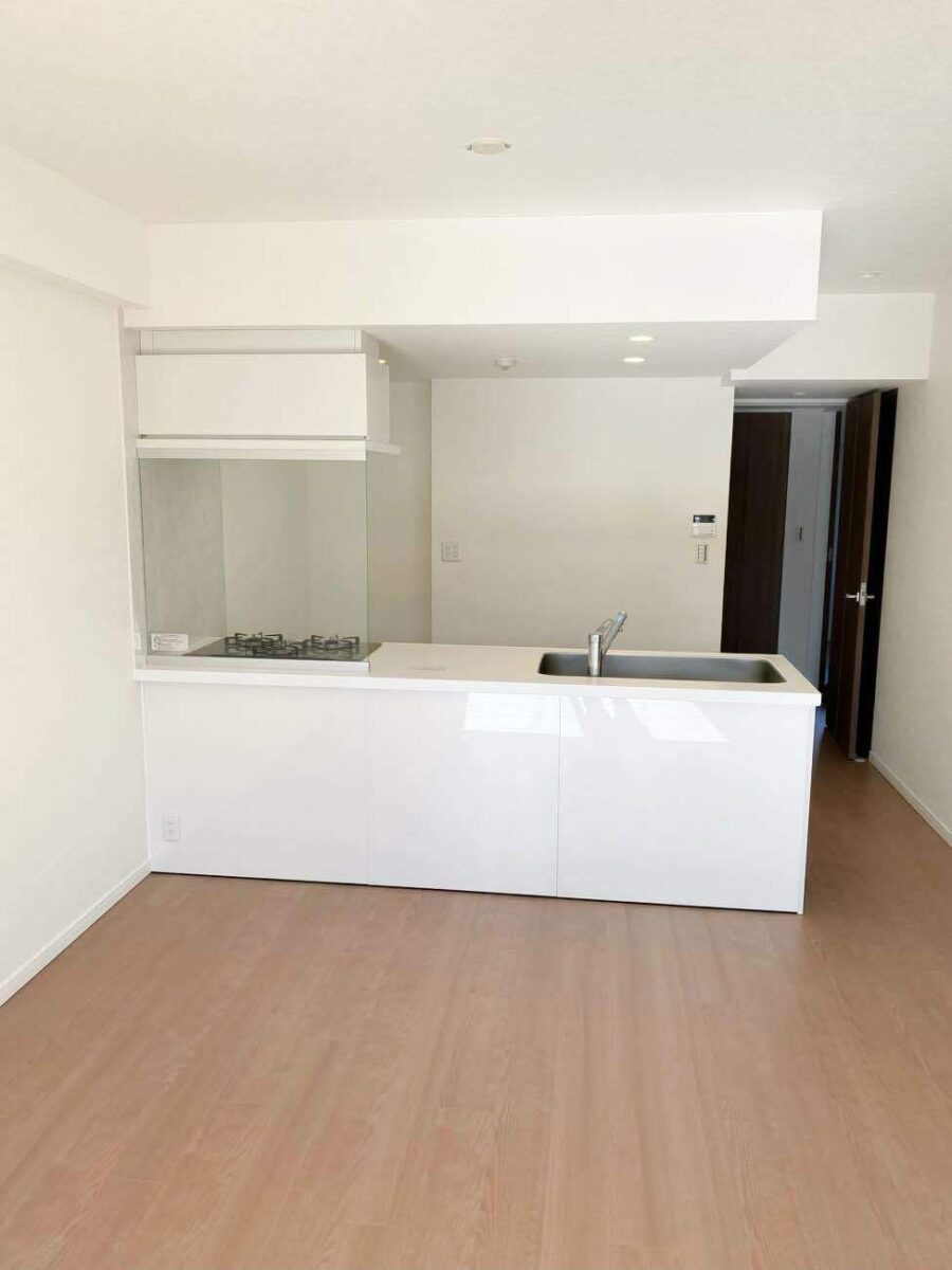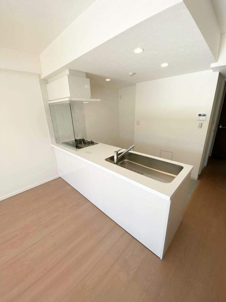 キッチンは、レンジフート側にある壁を無くしガラスにすることで、より開放感のあるキッチンになりました。また機能面も充実しており、お掃除がしやすいワークトップとガスコンロ、洗い物の際に便利な広々としたシンクと深型食洗器もあります。