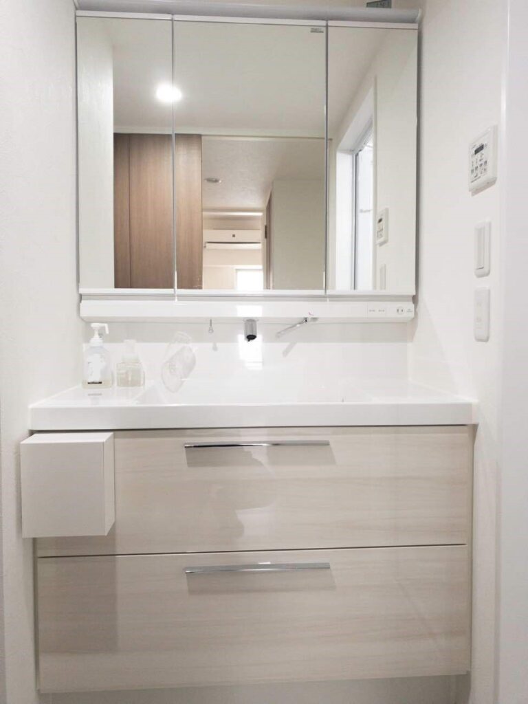 洗面化粧台の水栓がミラー下にある為、水栓まわりに水が溜まることはありません。そのためお掃除が簡単です。収納はフルスライドタイプでたっぷり奥まで収納が可能。取り出す時も簡単です。