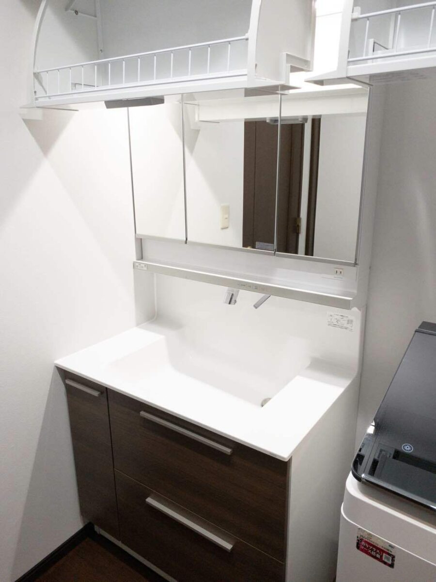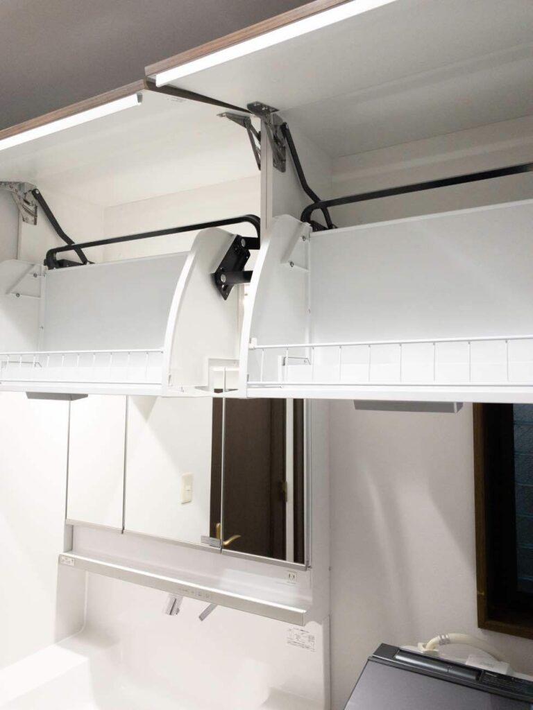 洗面は収納スペースを多く確保し、なおかつ使いやすくしたいというお客様のご要望により、昇降ウォールキャビネットを設置いたしました。昇降式のため、モノの出し入れ&収納がとても簡単です。
