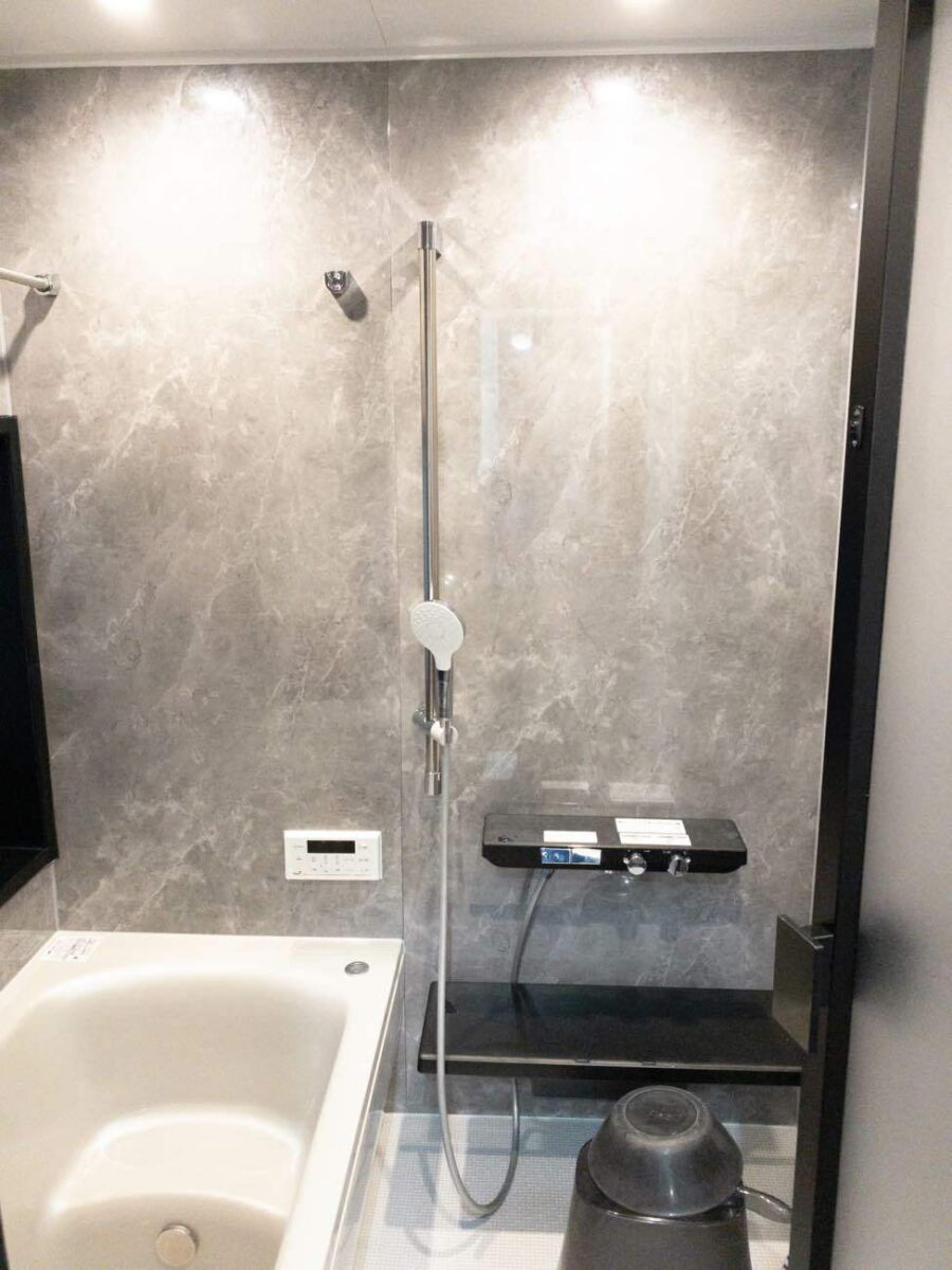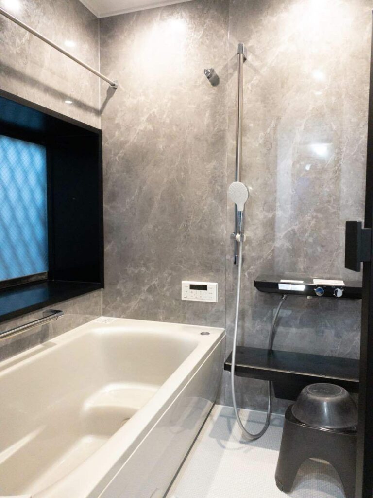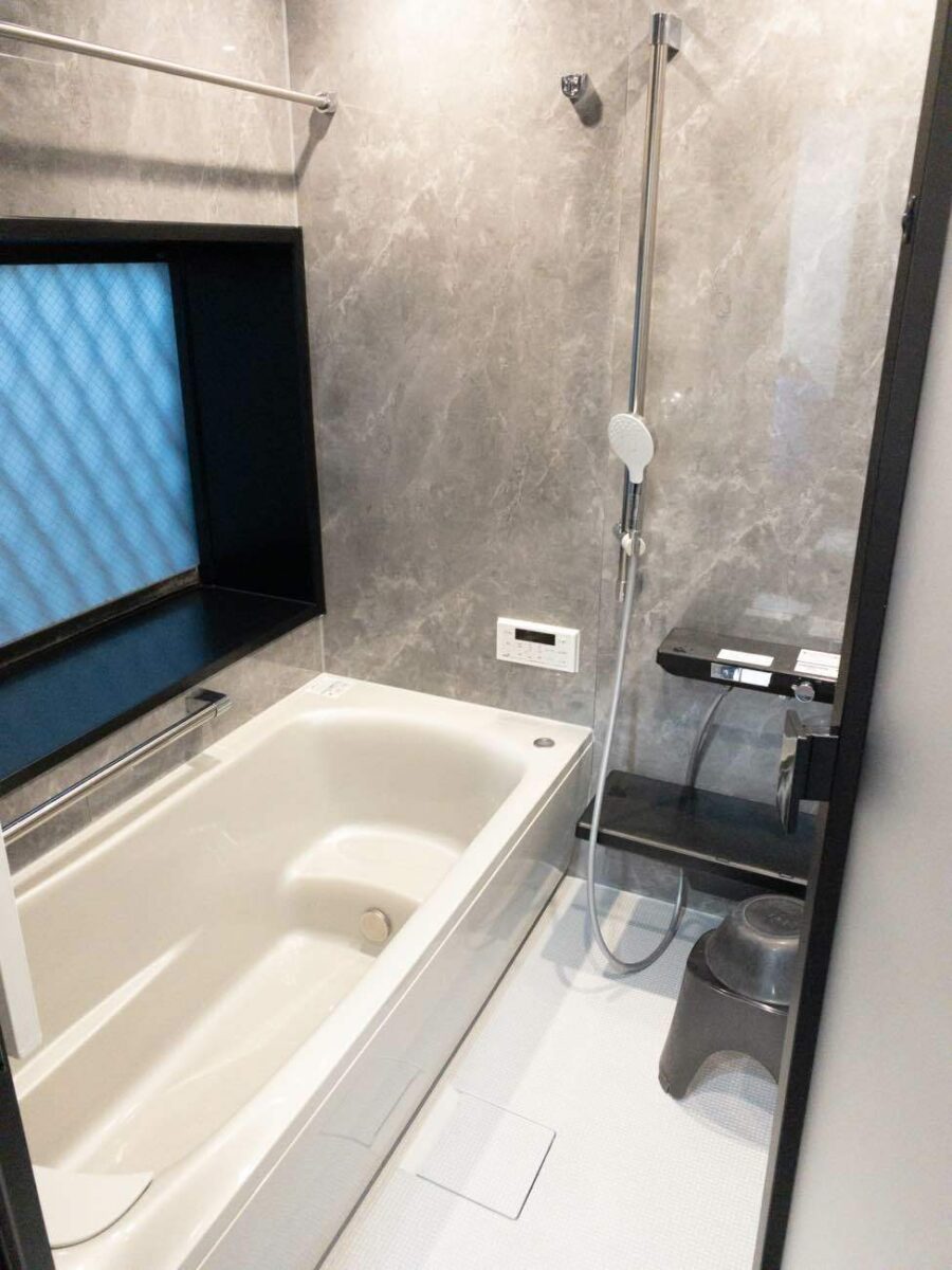 浴室は、ブラックを基調にしつつ、所々明るいカラーを使用することで、高級感がありながらも明るくスッキリとした浴室空間に仕上がりました。