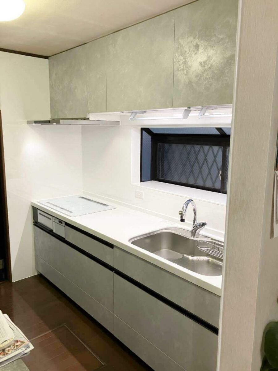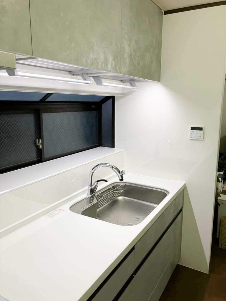 キッチンは逆にスッキリと清潔さを与えるようなカラーを選択し、上品な空間に仕上がりました。