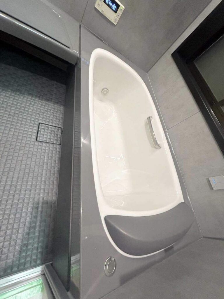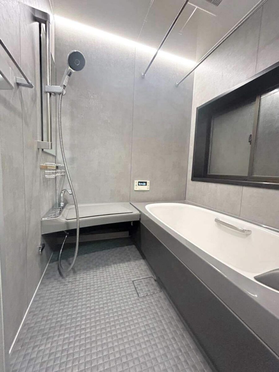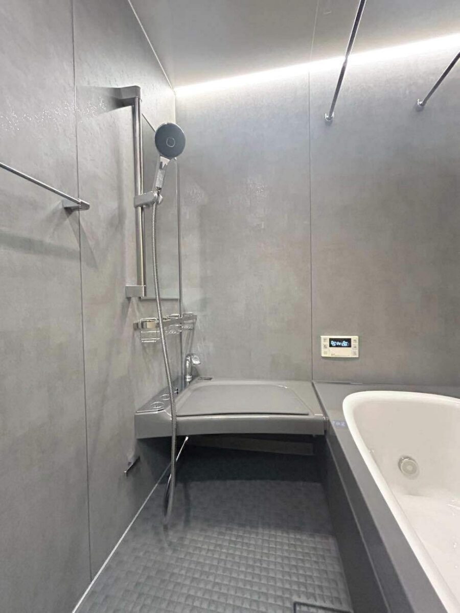 グレー調のパネルが際立つお洒落な浴室に変身。