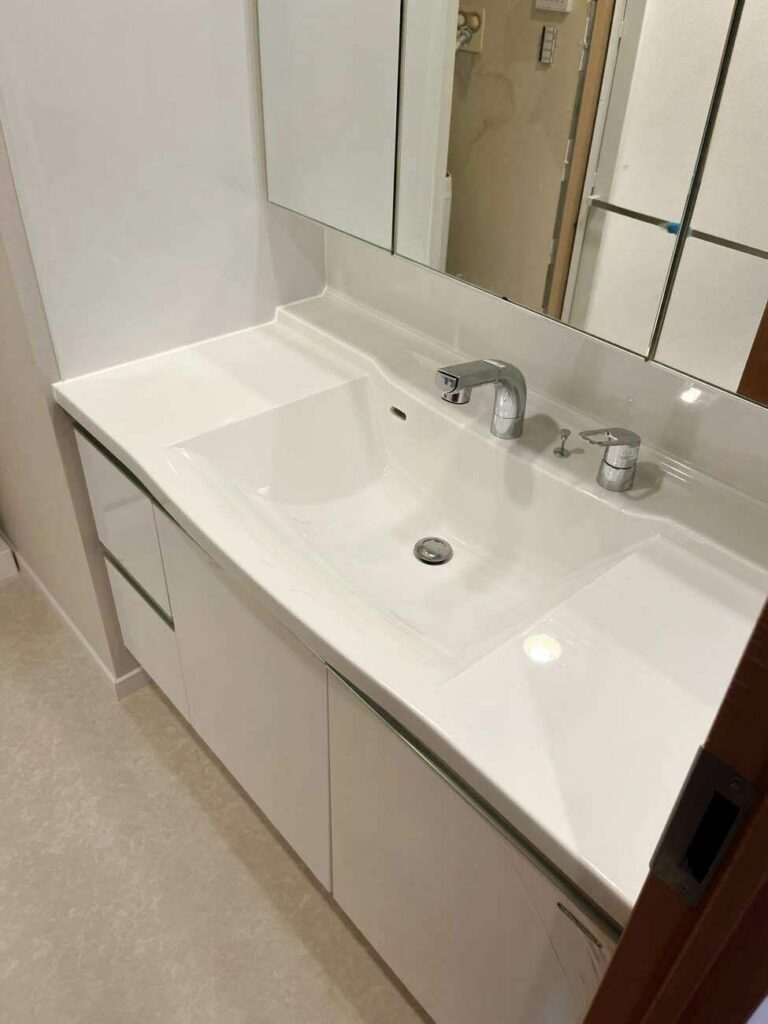洗面所は、下台交換のみにすることで収納力と清掃性をアップさせ、逆に費用面は抑え目でコスパ良しです。