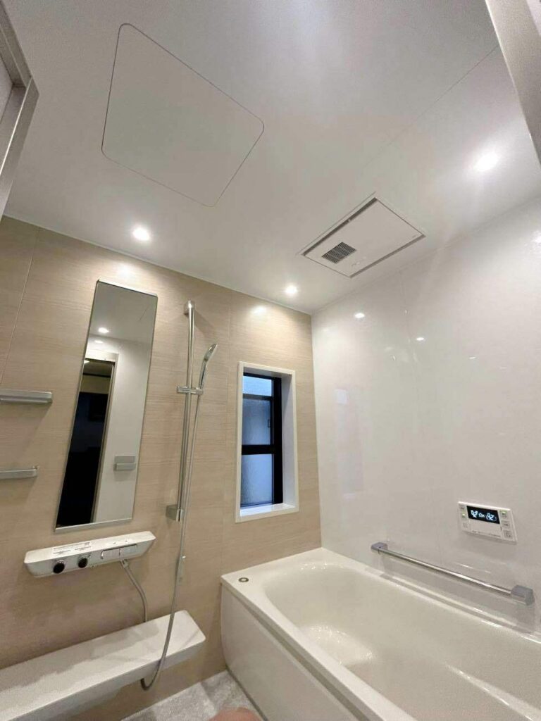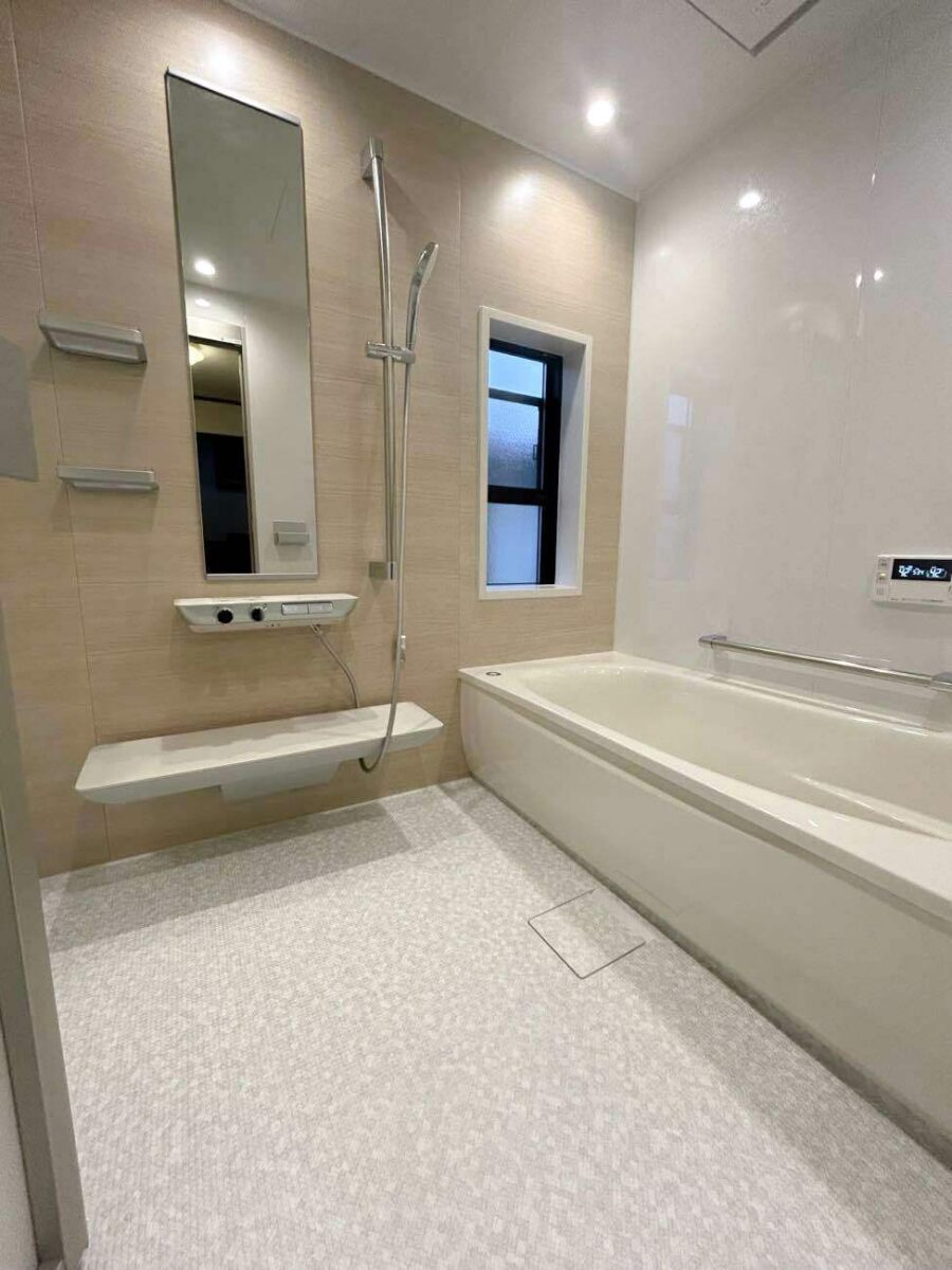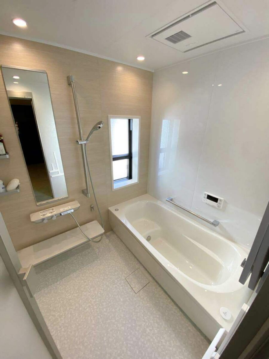浴室には、床ワイパー洗浄とお掃除浴槽がついていて、ボタンひとつで床掃除+浴槽のお掃除ができます。日々のお掃除がとてもラクになるかと思います。その他断熱性の高い人工大理石浴槽や掴みやすい位置に手すりを設置するなど、断熱性と利便性も高い浴室空間になりました。