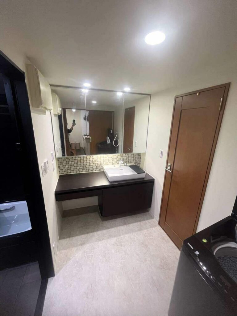 洗面はミラーを再利用し、洗面台とミラーの間にはモザイクタイルを貼っています。タイルが良いアクセントになっていますね。