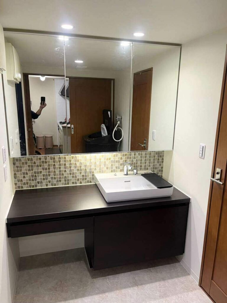 既存ミラーは再利用しつつ、洗面台とミラーの間にはモザイクタイルを貼っています。タイルが良いアクセントになっていますね。