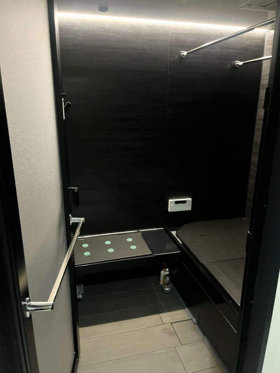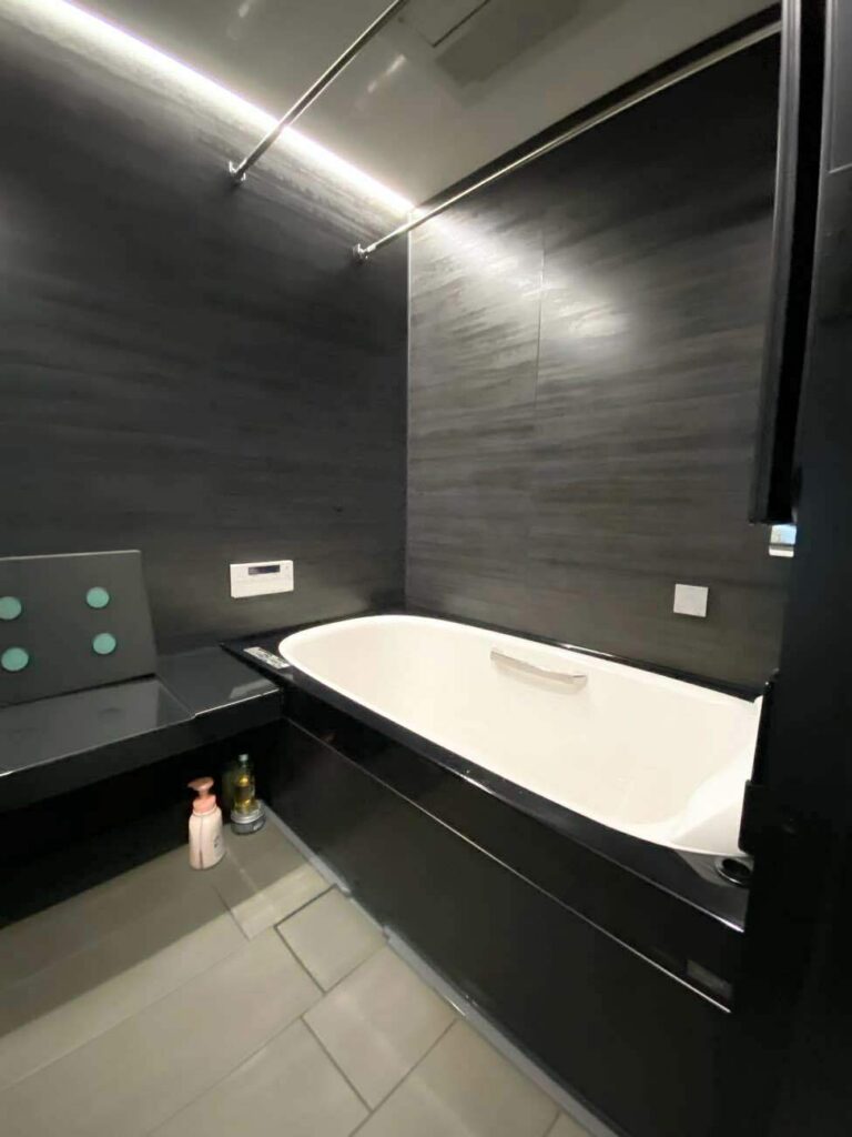 浴室はブラックを基調としたパネルと浴槽。お洒落なライン照明は圧倒的な高級感とお洒落さ感じさせます