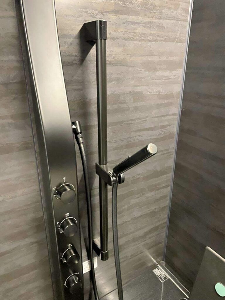 ブラックを基調としたパネルと浴槽、お洒落なライン照明は圧倒的な高級感を放っています。床は「グランフロア」といって落ち着いた木目柄で、一般的な浴室床を比べて、質感や雰囲気もだいぶ違いますし、お洒落度Maxです。
