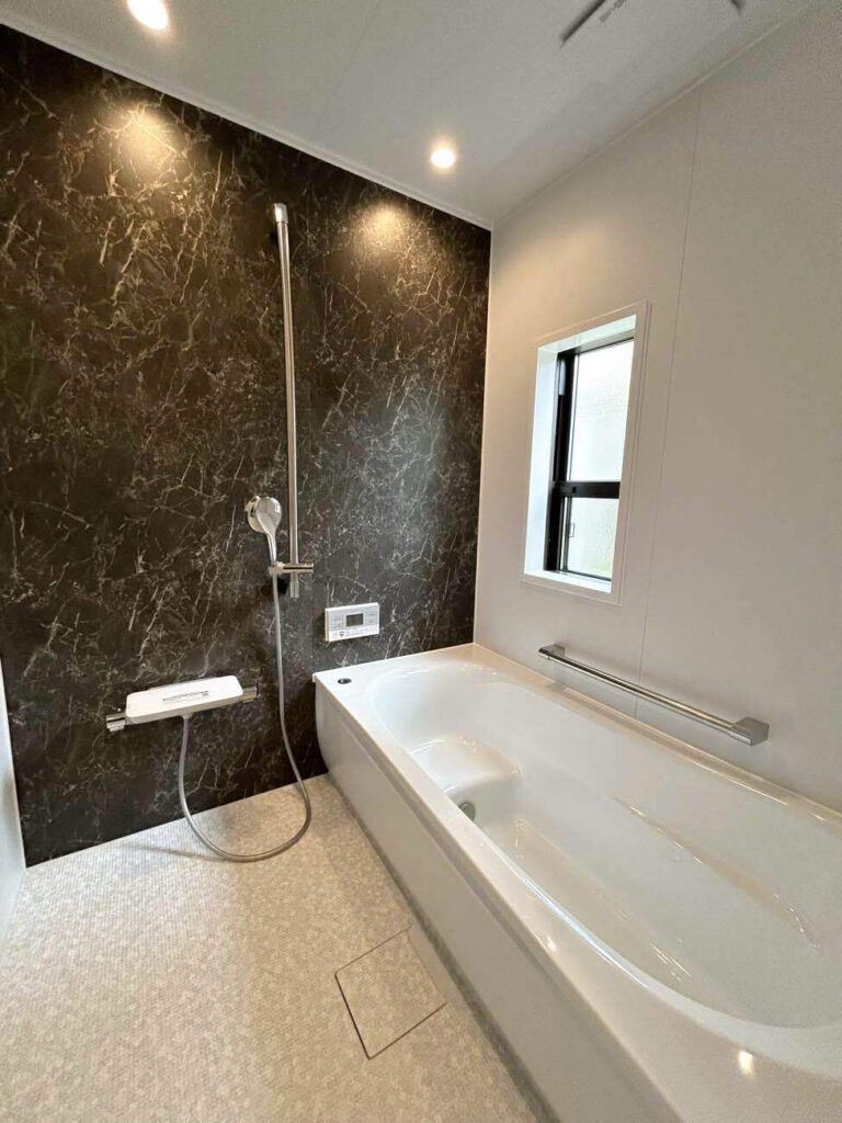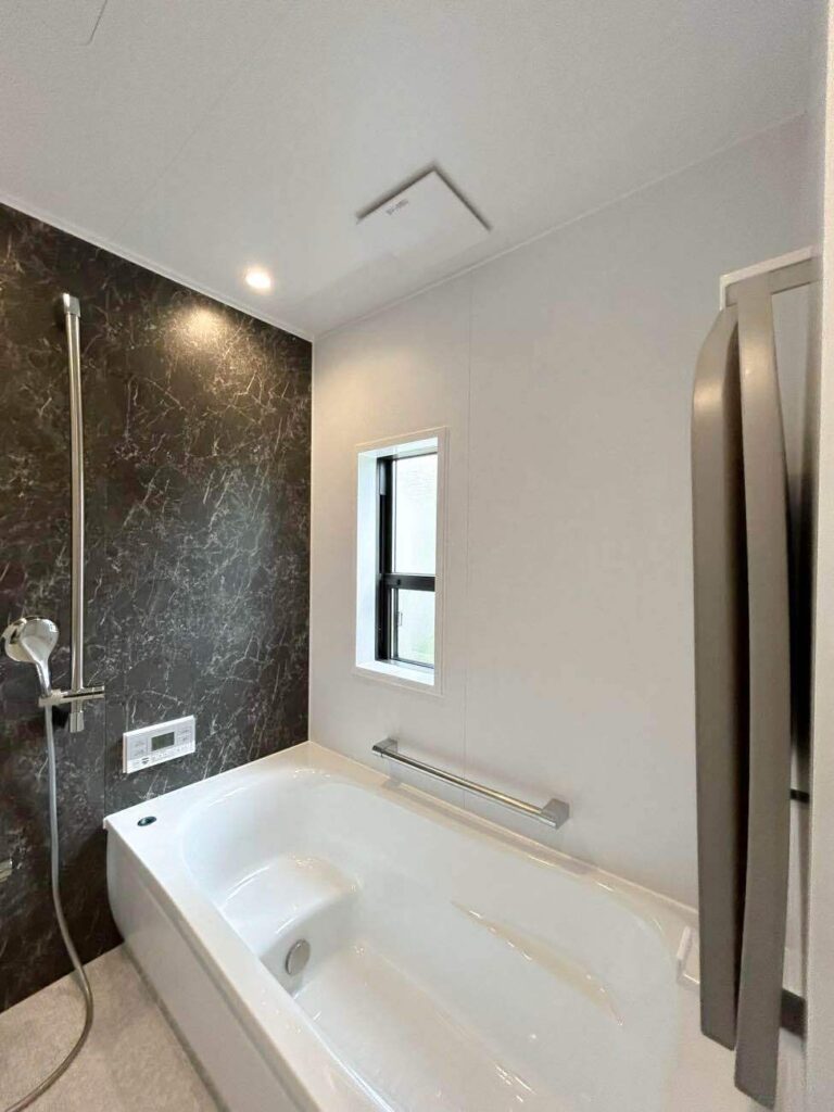 パネルアクセントに黒を基調とした「サバナグレー」というカラーを取り入れ、シンプルでもお洒落に感じる浴室に仕上がりました。棚や鏡などはマグネット式のものを後から取り付けることも可能なので、正面はシンプルな仕様になっています。
