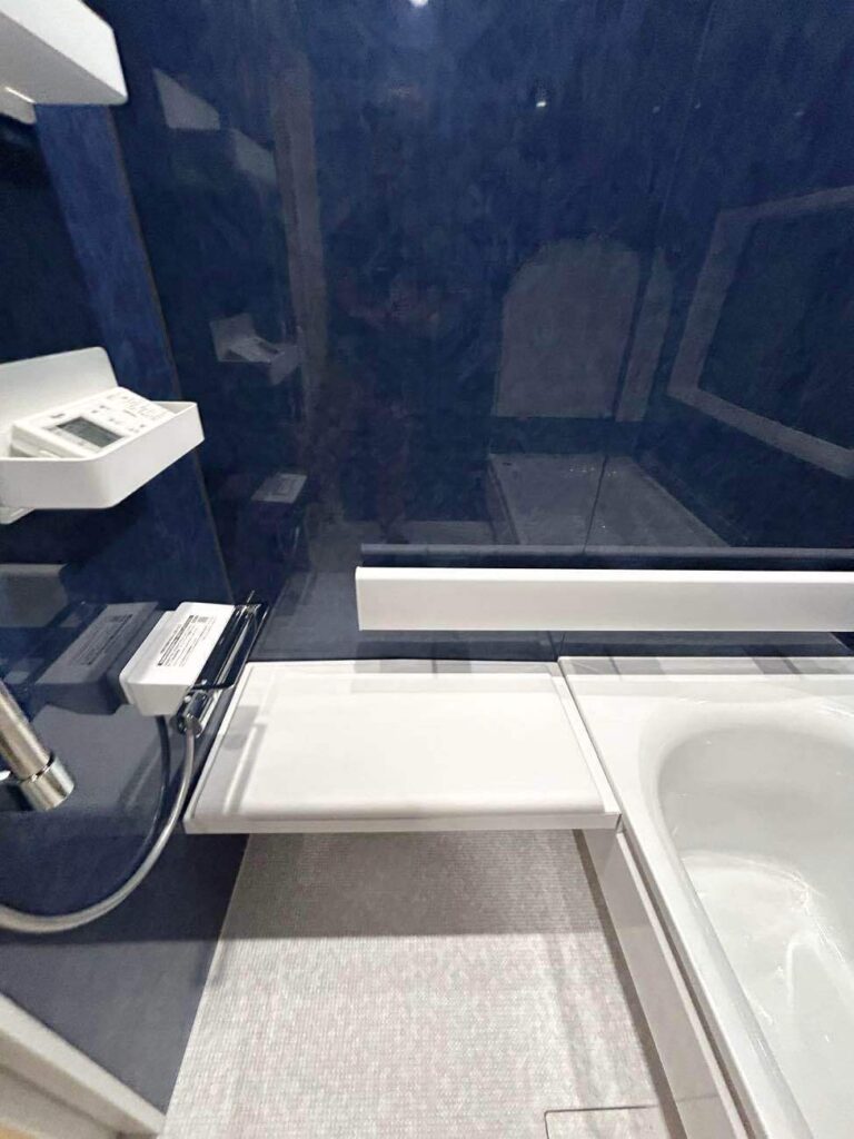 Fタイプは浴槽への移乗がラクなベンチタイプになっています。水栓はベンチの脇についているので、座ったままで操作が可能です。洗面器も溜めやすいですし、使い勝手に問題はありません。浴槽への移動も立ち上がることなく、座ったままできます。