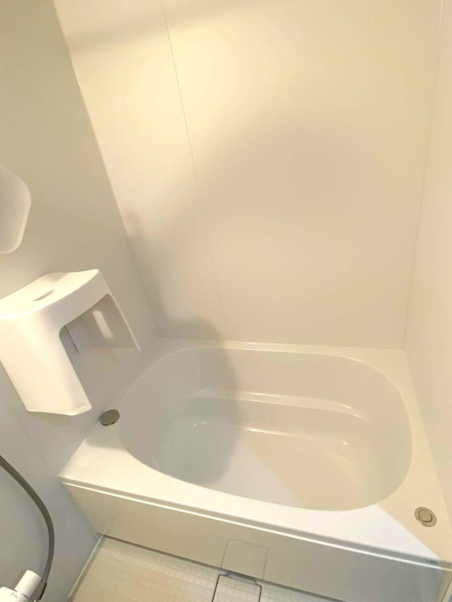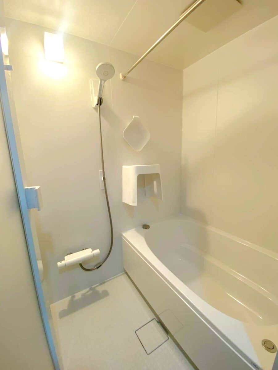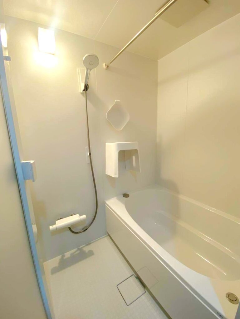 棚や鏡をなくした分、広々と使える浴室になりました。 壁はマグネット対応で、スペースを取られがちなイスや桶も壁につけられるのでより広く使えます。 浮かせた収納ができるので、汚れもたまりにくく、お掃除もしやすいのが嬉しいですね!